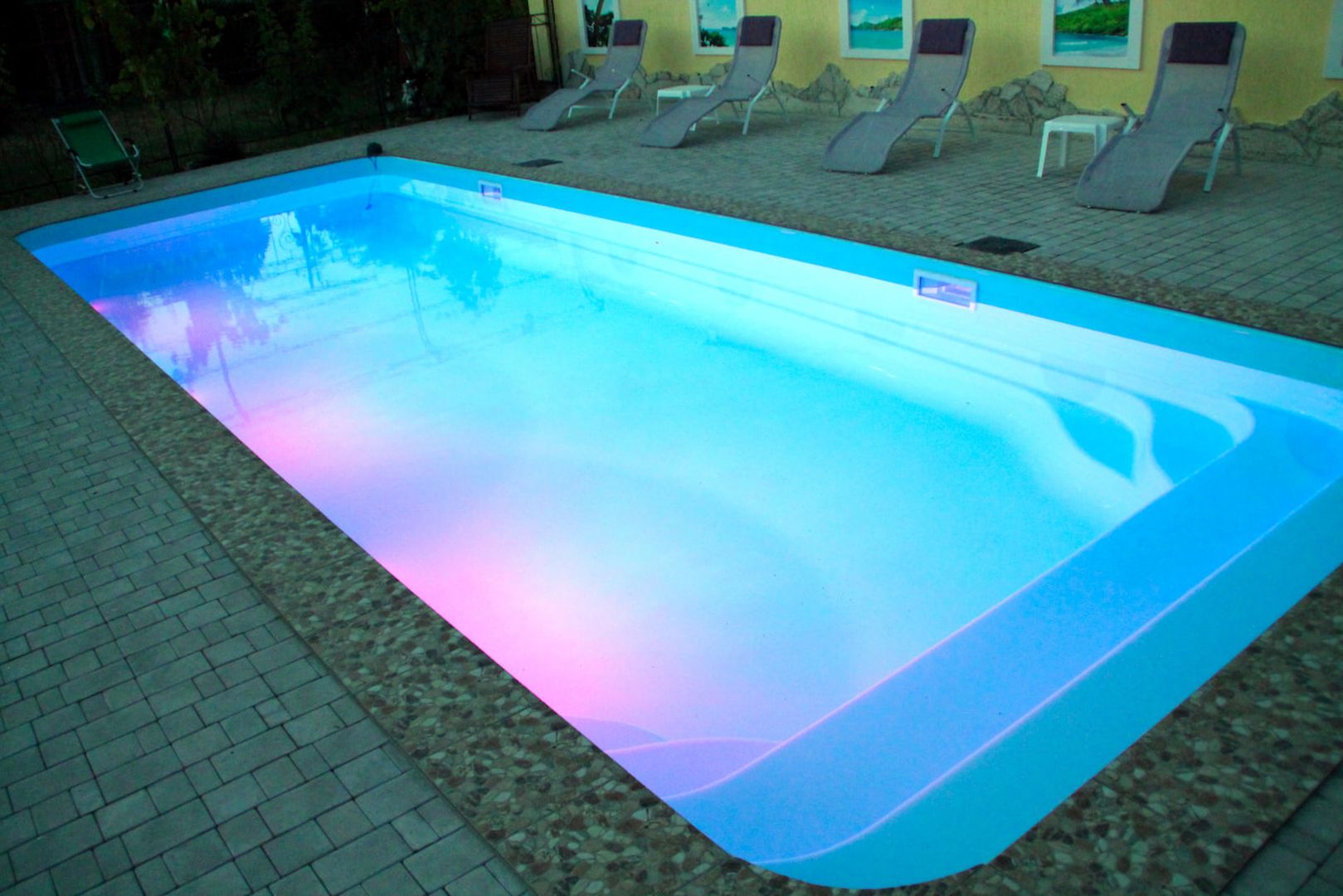 Бассейн с переливами разноцветной подсветки — яркое настроение и уют в одном кадре. Расслабьтесь в свете радуги!