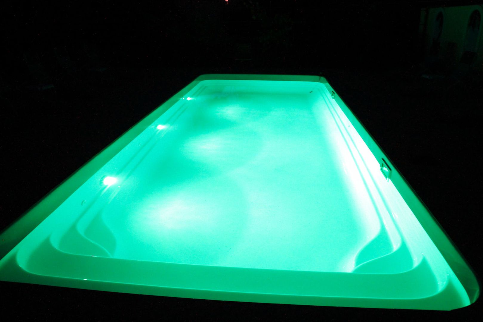 Бассейн, озаренный мягким зелёным светом, создаёт атмосферу загадочности. Идеальное место для вечернего релакса!