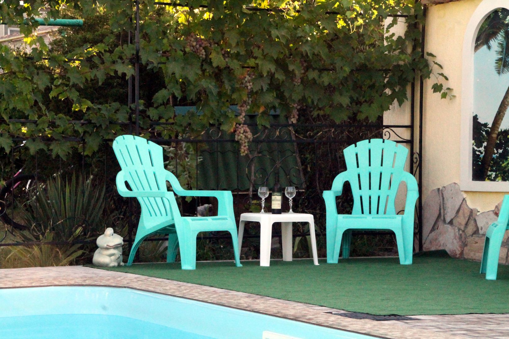 Погрузитесь в атмосферу лёгкости и уюта! Бирюзовые кресла у бассейна, небольшой столик с бокалами и бутылка вина — идеальное место для неспешного отдыха. Позвольте себе забыть о суете, наслаждаясь прохладой воды и пением птиц в тени зелёных насаждений.