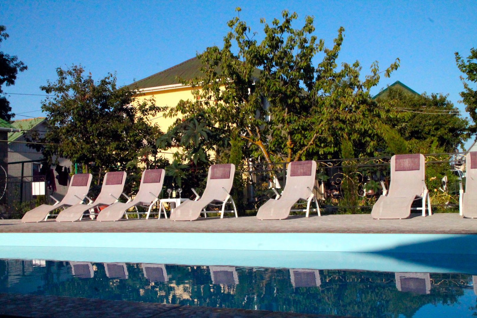 Бассейн с кристально чистой водой, окружённый зеленью и дополненный удобными шезлонгами — идеальное место для отдыха. Позвольте себе наслаждаться каждым моментом!