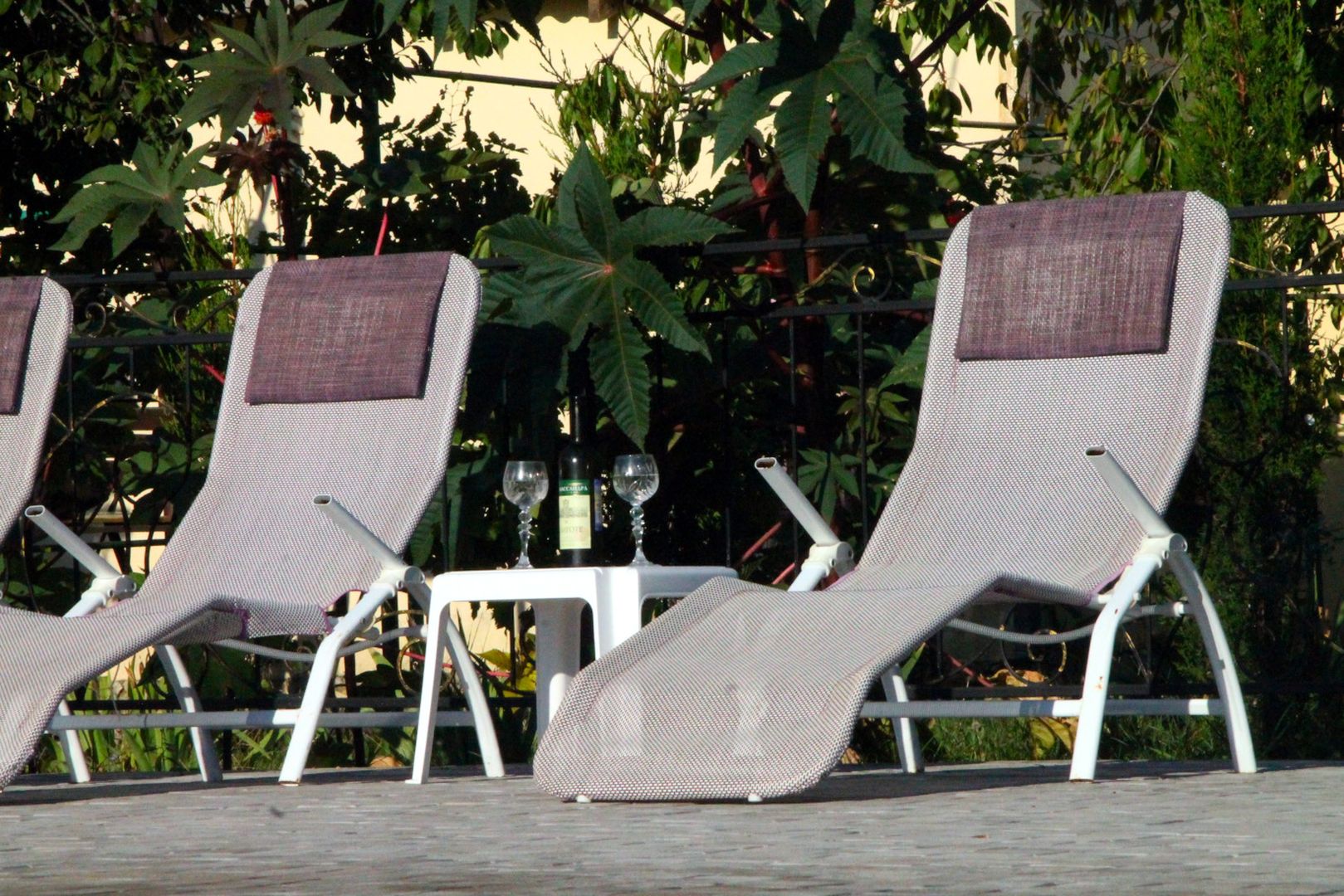 Позвольте себе насладиться моментом уединения у бассейна! Удобные шезлонги с мягкими подголовниками приглашают расслабиться в тени пышной зелени. Небольшой столик с бутылкой вина и бокалами создаёт атмосферу изысканного отдыха.
