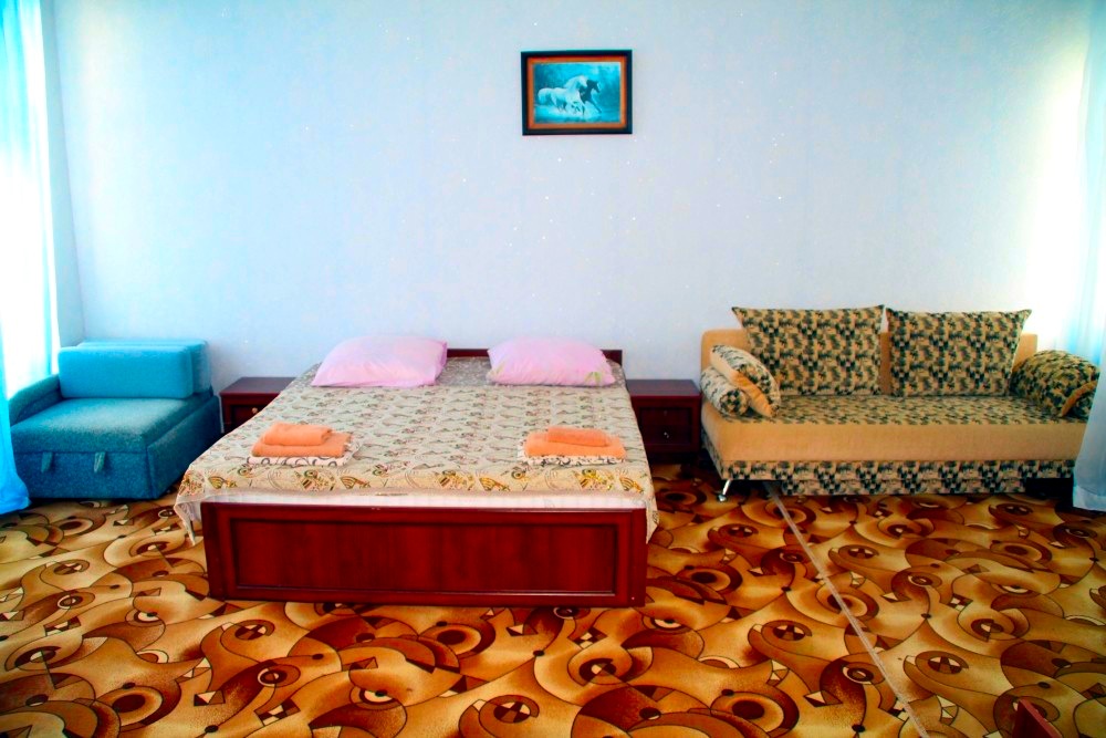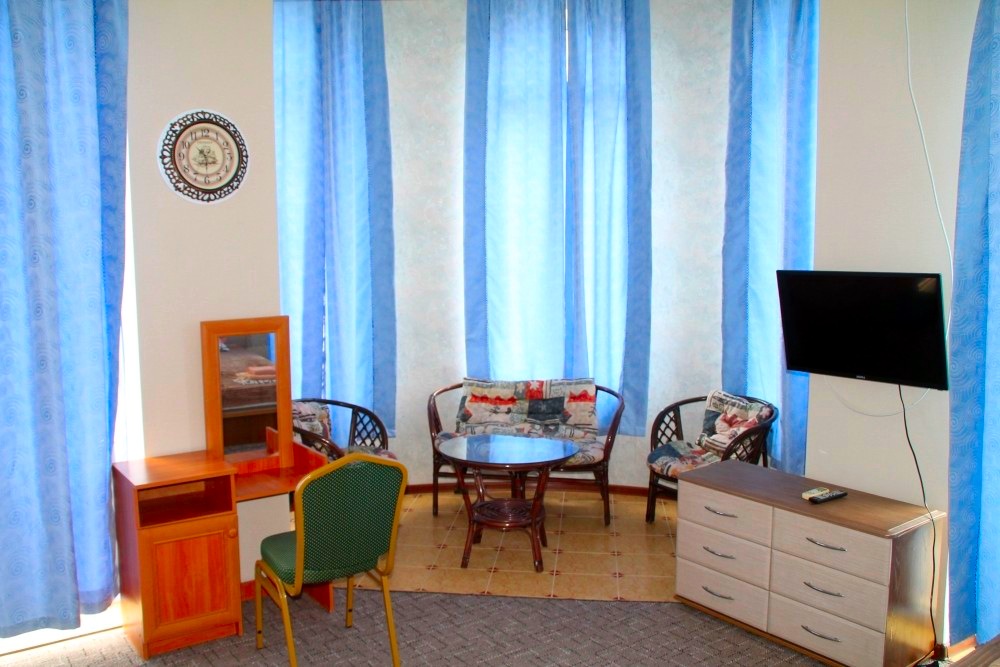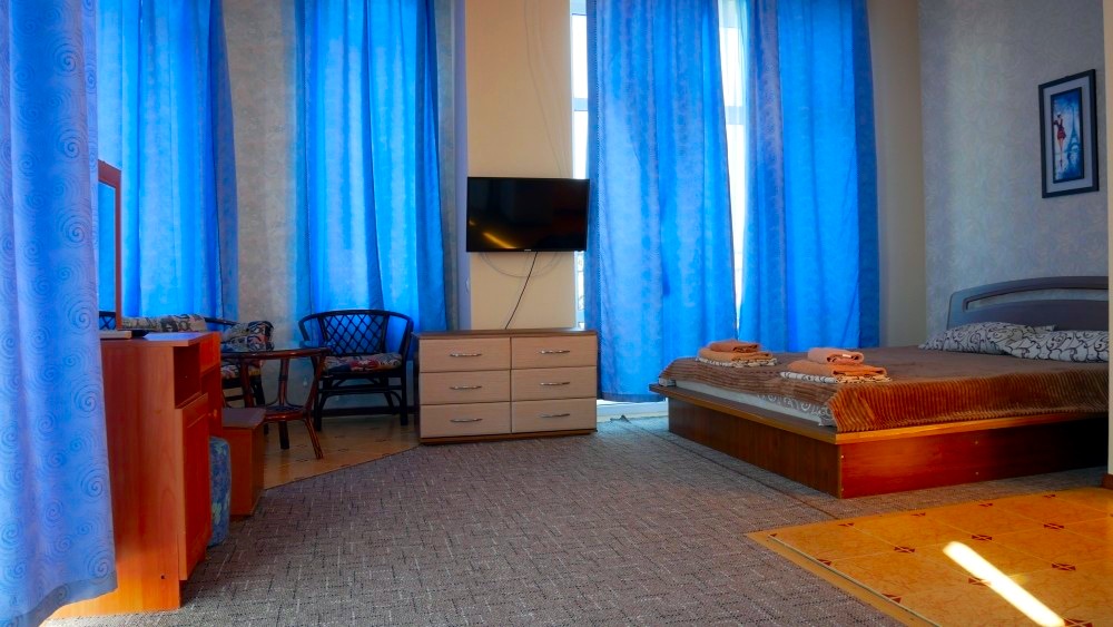 Номер в 2-х этажном корпусе КАРИНА. 1-но комнатный 30м2 + балкон с видом на море . Рассчитан на 2х гостей. Допускается 1-2 доп. места. В Номере 2-х спальная 160х200 . раскладной диван 160х 200. или 1-но спальная кровать 090х200. Шкаф, тумбочки, комод, трюмо, столик, кресла,стулья, ТВ, холодильник, кондиционер. Чайный набор. В каждом номере сан/узел с душевой кабиной и феном. На балконах стол, стулья. Вид на море.