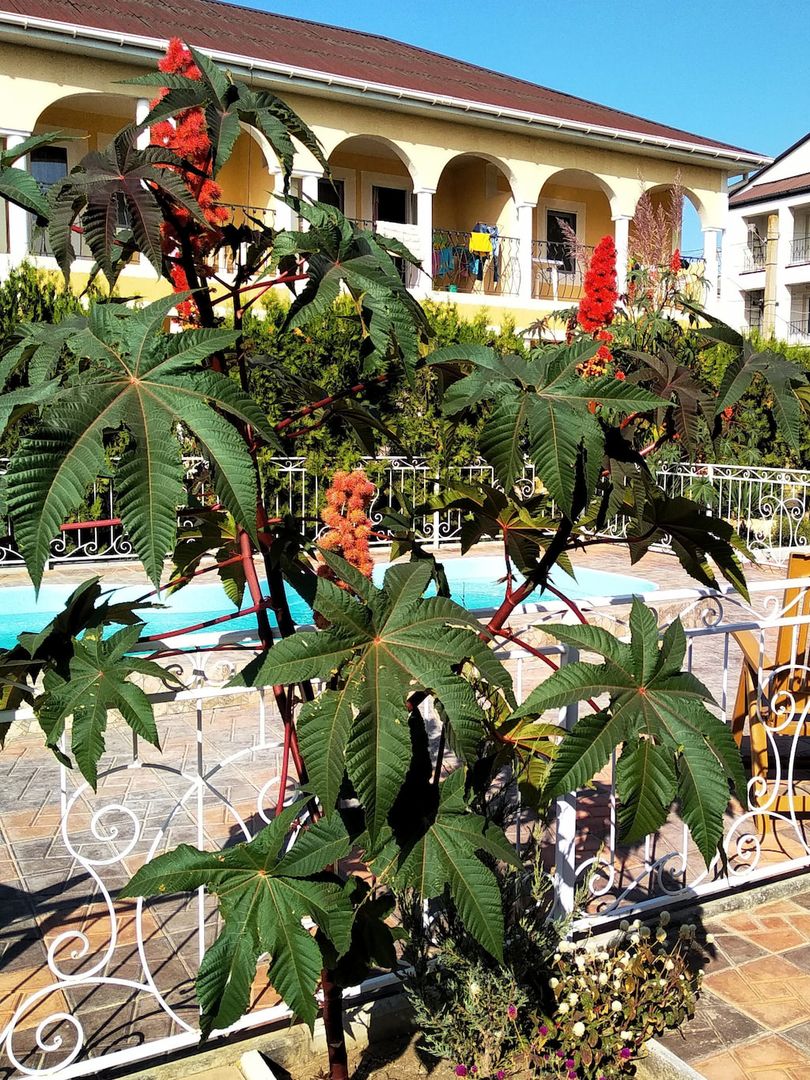 Погрузитесь в атмосферу уюта и свежести! Пышная зелень клещевины с яркими соцветиями обрамляет зону бассейна, создавая ощущение уединённого тропического уголка