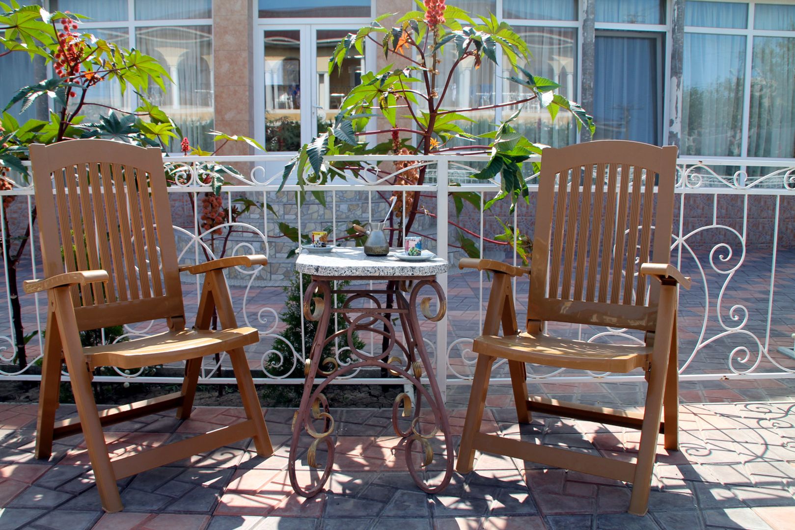 Уютная терраса с деревянными креслами и изящным столиком приглашает к неспешным разговорам. Лёгкий морской бриз, солнечные блики на листьях и вид на зелёные растения создают атмосферу умиротворения. Здесь каждое утро начинается с улыбки, а вечера наполнены теплом общения.