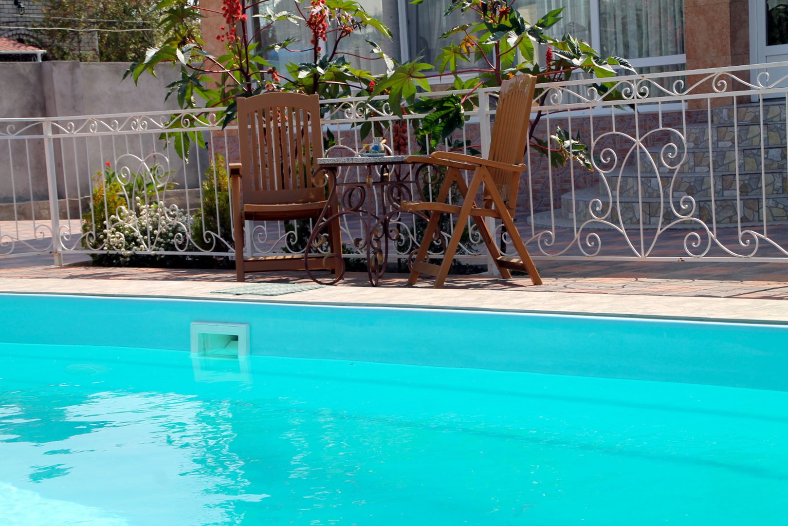 Погрузитесь в атмосферу лёгкости и уюта! Бирюзовые кресла у бассейна, небольшой столик с бокалами и бутылка вина — идеальное место для неспешного отдыха. Позвольте себе забыть о суете, наслаждаясь прохладой воды и пением птиц в тени зелёных насаждений.